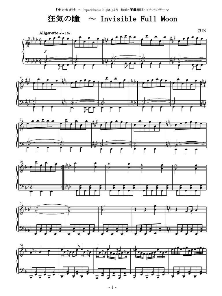 Piano Sheet Music 东方永夜抄 触手猴 狂気の瞳 Invisible Full Moon Www Gangqinpu Com