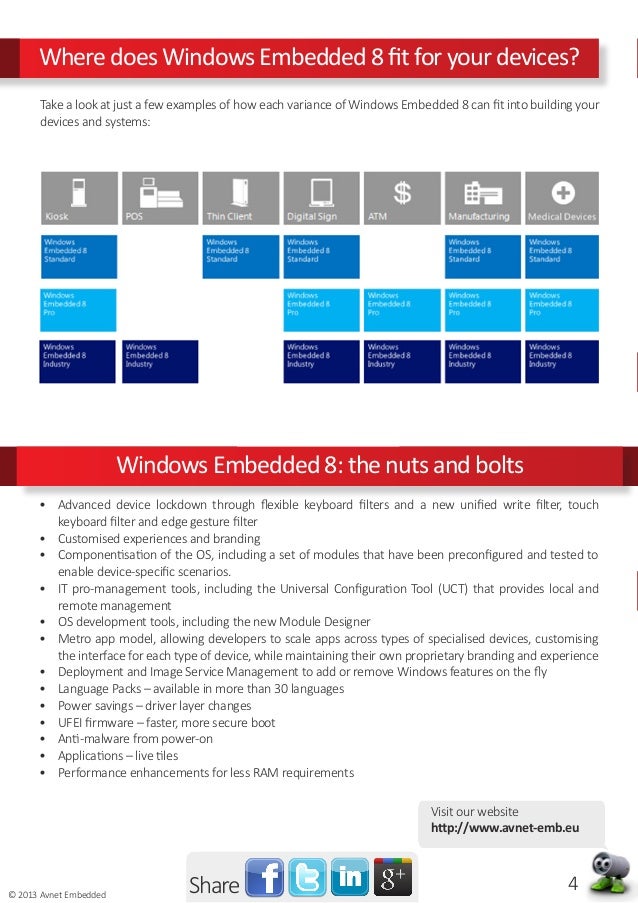 As part of the launch, Microsoft has created a Windows Embedded 8 launch portal that …. Available only in India Windows Embedded 8 Standard. Windows Embedded 8 Standard is a flexible, modular, version of Windows 8 that gives enterprises and partners the freedom to choose which parts of the operating system they need for their unique.